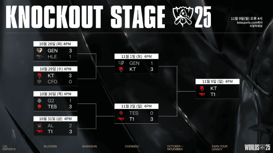 리그 오브 레전드(League of Legends; LoL)를 개발, 서비스하고 있는 라이엇 게임즈는 10월 28일(화)부터 11월 2일(일)까지 중국 상하이 메르세데스-벤츠 아레나에서 진행된 2025 LoL 월드 챔피언십 8강과 4강에서 LCK 대표로 출전한 kt 롤스터와 T1이 결승에 진출했다고 밝혔다.