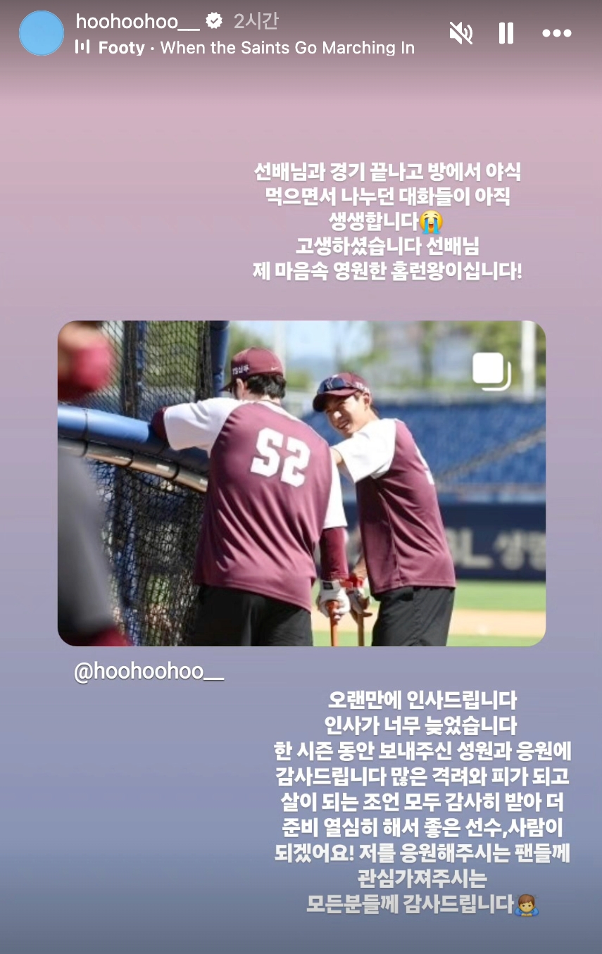 이정후는 "선배님과 경기 끝나고 방에서 야식 먹으면서 나누던 대화들이 아직 생생합니다"라고 눈물 짓는 이모티콘을 올린 후 "고생하셨습니다 선배님. 제 마음 속 영원한 홈런왕이십니다"라고 적었다.