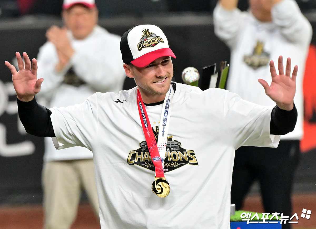 지난달 31일 오후 대전 한화생명 볼파크에서 열린 '2025 신한 SOL Bank KBO 한국시리즈' LG 트윈스와 한화 이글스의 5차전 경기, LG가 선발투수 톨허스트의 7이닝 1실점 완벽투에 힘입어 4:1의 스코어로 승리하며 시리즈 전적 4승1패로 통합우승을 이뤘다. 한국시리즈 5차전 데일리MVP를 수상한 LG 톨허스트가 기뻐하고 있다. 엑스포츠뉴스 DB