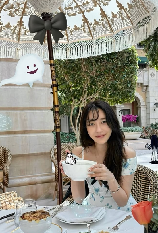 공개된 사진 속 이지아는 잘 꾸며진 야외 테이블에 앉아 식사를 하고 있는 모습이다. 커다란 파라솔과 다양한 꽃들이 이국적인 분위기를 자아낸다. 우아한 이지아의 이미지와 잘 어울린다.