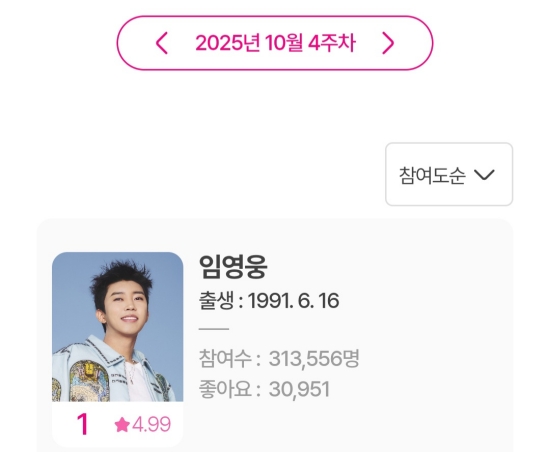 아이돌차트에 따르면, 지난 10월 27일부터 11월 2일까지 집계된 평점랭킹에서 임영웅은 313,556표를 얻어 최다득표를 기록했다.