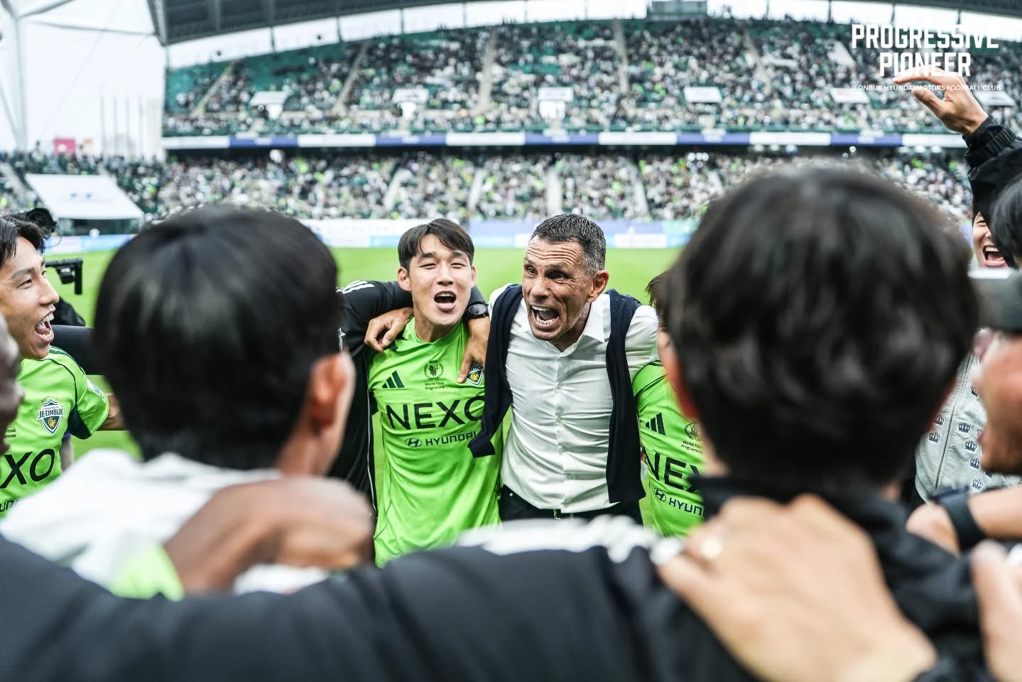 전주성에 입장하는 순간 K리그1 10회 우승의 '라 데시마' 엠블럼 그라운드 배너가 센터 서클에 펼쳐지며 우승 대관식 현장을 알린다.