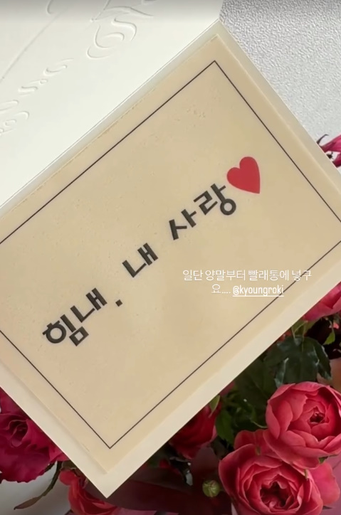 이어 공개된 또 다른 사진에는 “힘내. 내 사랑”이라는 메시지가 담긴 카드가 포착됐다. 붉은 장미꽃과 함께 놓인 이 카드는 남편 김경록이 건넨 결혼기념일 선물로 보인다. 황혜영은 “일단 양말부터 빨래통에 넣구요…”라며 재치 있게 덧붙여 웃음을 자아냈다.
