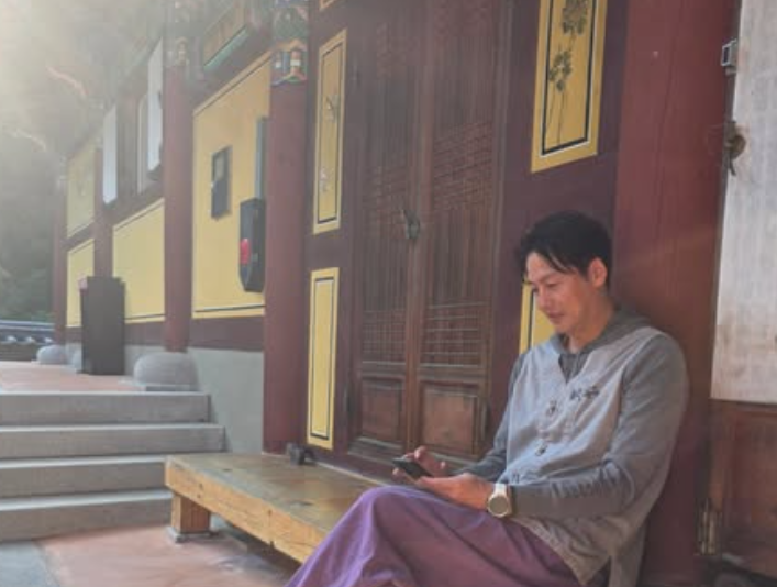 사진 속 이정진은 '템플 스테이' 복장을 하고 절 건물의 앞마루에 앉아 휴대폰을 보면서 편안하게 휴식을 취하고 있다. 절 건물이 풍기는 고즈넉한 분위기와 여유로워 보이는 이정진의 모습이 잘 어우러져 눈길을 끈다.