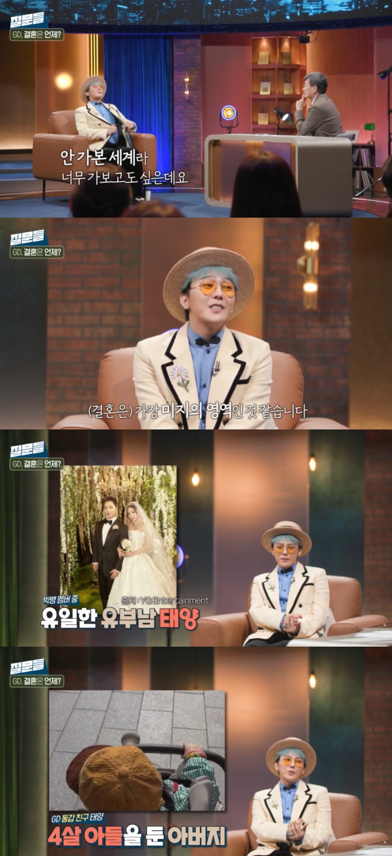 "오늘 중 얼굴이 가장 빛난다"는 말에 지드래곤은 "저에게 지금은 (결혼이) 가장 미지의 영역 같다. 멤버 중 태양이 결혼도 하고 아이의 아버지다"라며 빅뱅의 유일한 유부남을 언급했다.