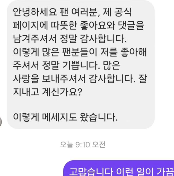 팬에게 제보받은 메시지도 공개했다. 사칭계정은 한 팬에게 "제 공식 페이지에 따뜻한 좋아요와 댓글을 남겨주셔서 정말 감사합니다. 이렇게 많은 팬분들이 저를 좋아해 주셔서 정말 기쁩니다. 많은 사랑을 보내주셔서 감사합니다. 잘 지내고 계신가요?"라는 메시지를 보내왔다고. 이러한 제보에 정은표는 "고맙습니다"라고 답했다.