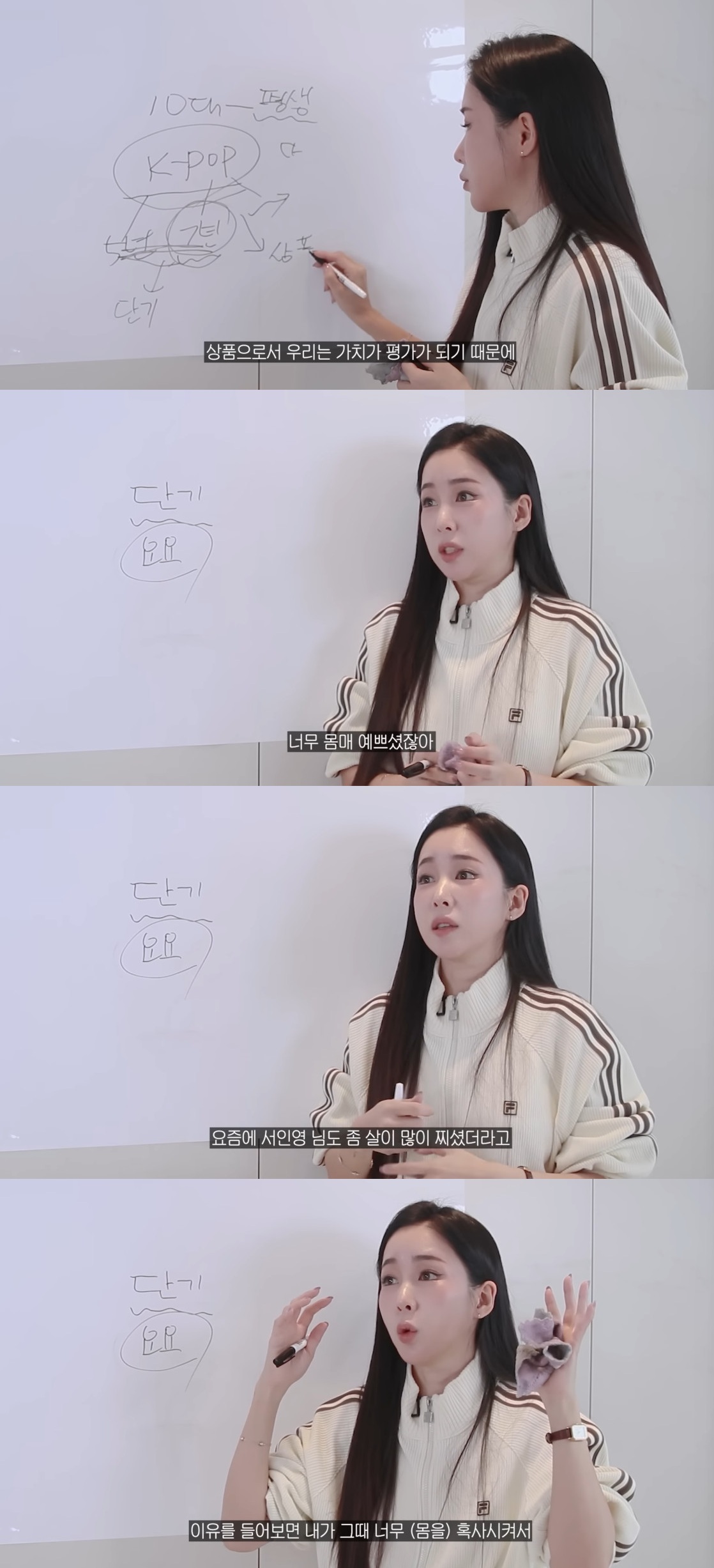 이날 웨이는 "(걸그룹 계약이) 요즘 7년이다. 짧지 않나. 단기다. 상품으로 가치가 평가되기 때문에 짜내는 다이어트를 시킨다"며 "'연예인이 이렇게 뺐다더라'하며 방법이 되어 버린다. 진짜 잘못된 다이어트다. 유명인 따라하면 안 된다"고 강조했다.