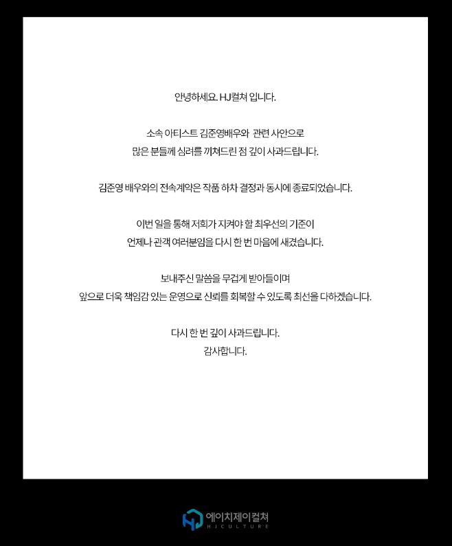 이 가운데 7일 소속사는 공식 계정을 통해 "김준영 배우와의 전속계약은 작품 하차 결정과 동시에 종료됐다"며 김준영과의 전속계약 종료 사실을 알렸다.