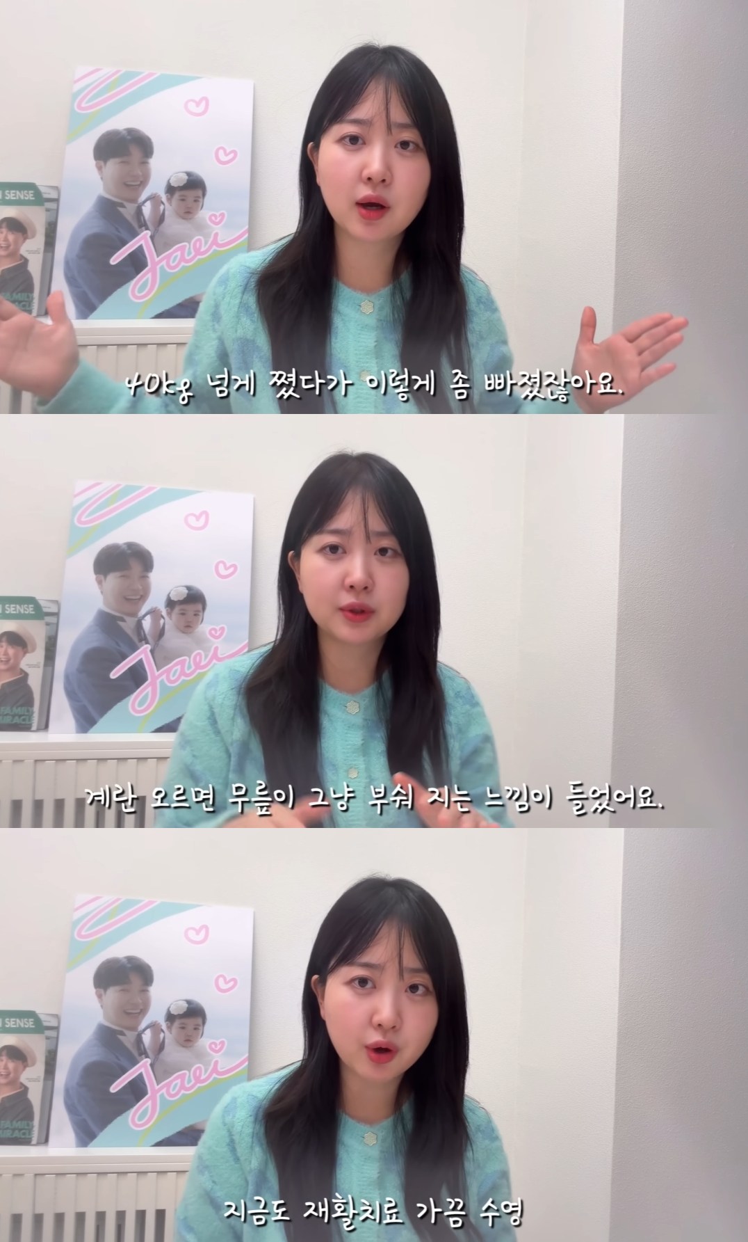 김다예는 "운동은 제가 못 했다. 출산하고 연골 마디마디 뼈 마디마디가 그냥 다 나가버려서 걷기도 힘들고, 계단 오르면 무릎이 그냥 부숴지는 느낌이 들었다"고 말했다.