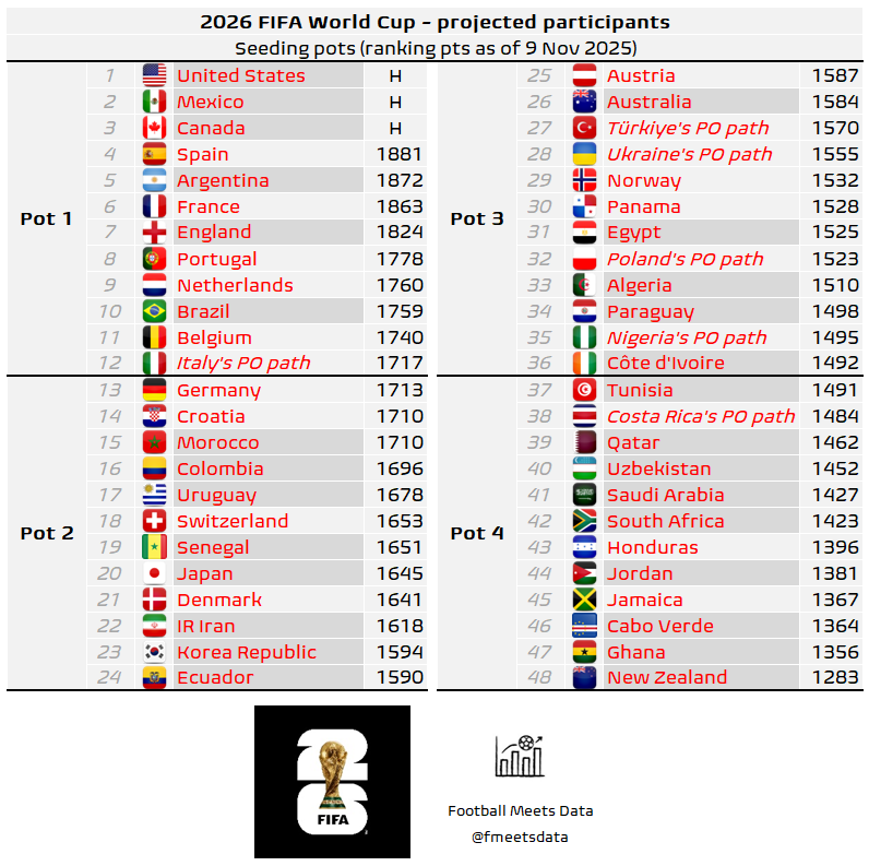 '풋볼 미츠 데이터'는 "2026 월드컵에서는 FIFA가 각 플레이오프 패스(조)에서 가장 높은 순위를 기록한 팀의 순위에 따라 플레이오프 팀 6개(유럽 플레이오프 4팀, 대륙간 플레이오프 2팀) 모두 적합한 시드에 배정할 가능성이 높다"라고 설명했다.