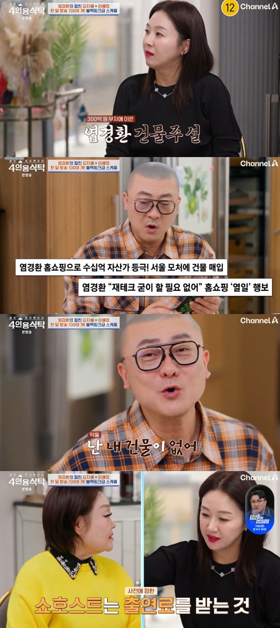 10일 방송된 채널A ‘절친 토큐멘터리 – 4인용 식탁’에서는 홈쇼핑계를 평정한 ‘완판남’ 염경환이 절친 김지혜, 이혜정과 함께 출연했다.