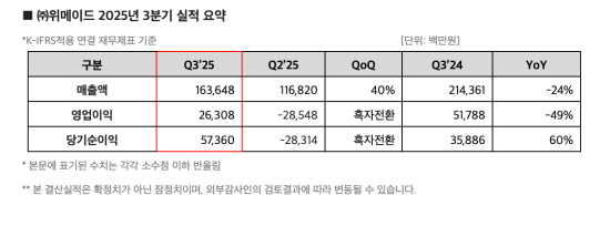 (엑스포츠뉴스 유희은 기자) 위메이드(대표 박관호, [112040])가 11일(화) 2025년 3분기 실적을 발표했다. 한국채택국제회계기준(K-IFRS)을 적용한 연결 재무제표 기준 ▲매출 약 1,636억원 ▲영업이익 약 263억원 ▲당기순이익 약 574억원으로 집계됐다.