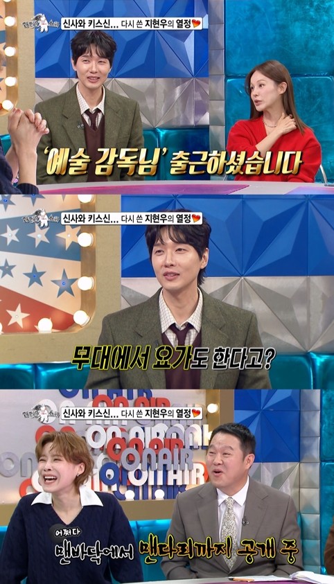 또한 MC 김국진이 지현우에게 “무대 위에서 요가를 한다고요?”라고 묻자, 지현우는 “몸풀기용으로 요가를 해요.”라고 밝힌다. 이어 MC의 요가 시범 요청이 쏟아졌고, 지현우는 벌떡 일어나 스튜디오 바닥에서 187cm의 장신을 자랑하며 요가 실력을 뽐낸다. 지현우는 맨바닥에서 맨다리와 맨살까지 오픈하며 보여준 ‘신사의 요가’ 현장에 모두가 감탄과 웃음을 터뜨린다.