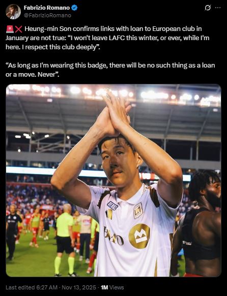 이적 시장 전문가 파브리치오 로마노는 12일 자신의 X(구 트위터)에 "손흥민이 1월 유럽 임대설을 부인했다"며 "'나는 이 겨울에도, 또 그 이후에도 LAFC를 떠나지 않을 것이다. 이 클럽을 깊이 존중한다'고 말했다"며 그의 발언을 인용했다.