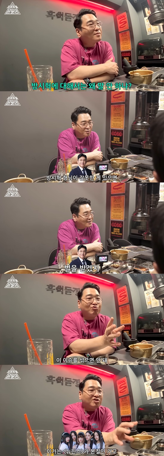 윤일상은 "방시혁 형님이 잘못한 게 있으면 벌을 받을 거다. 근데 그거랑 이거는 다른 이슈다. 섞으면 안 된다"며 "이건 뉴진스가 본질인 거다. 방시혁이 잘못을 한 건 다른 이슈다. 그걸 섞으면 안 된다"고 자신의 의견을 전했다.