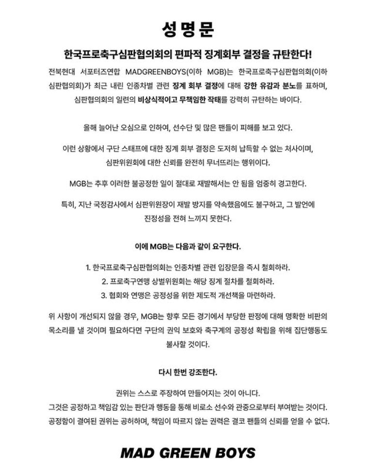 전북 서포터스 연합 매드 그린 보이즈(MAD GREEN BOYS·MGB)도 13일 사회관계망서비스(SNS) 계정을 통해 "한국프로축구심판협의회의 편파적 징계회부 결정을 규탄한다"라고 성명을 발표했다.
