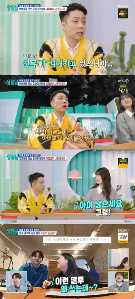 은지원은 박서진에게 팬심이 이동하는 건 인구가 적어지고 있어서 어쩔 수 없다며 어른들이 아이를 많이 낳아야 한다고 강조했다.