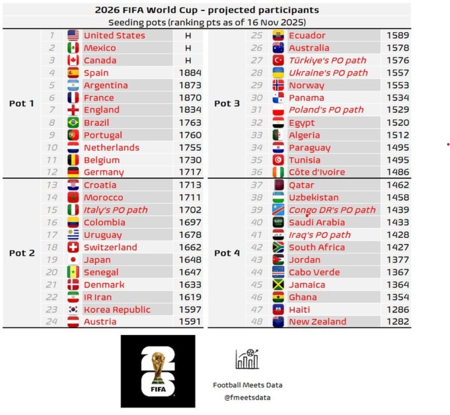 내년 6월 개막하는 2026 월드컵(캐나다·미국·멕시코 공동개최)엔 총 48개팀이 참가한다. 48개국은 12개국씩 나뉘어 포트1~4에 배정되고, 다음달 6일 미국 워싱턴 DC에서 열리는 본선 조추첨 때 각 포트에서 한 팀씩 뽑혀 A조부터 L조까지 12개 조에 배정된다.