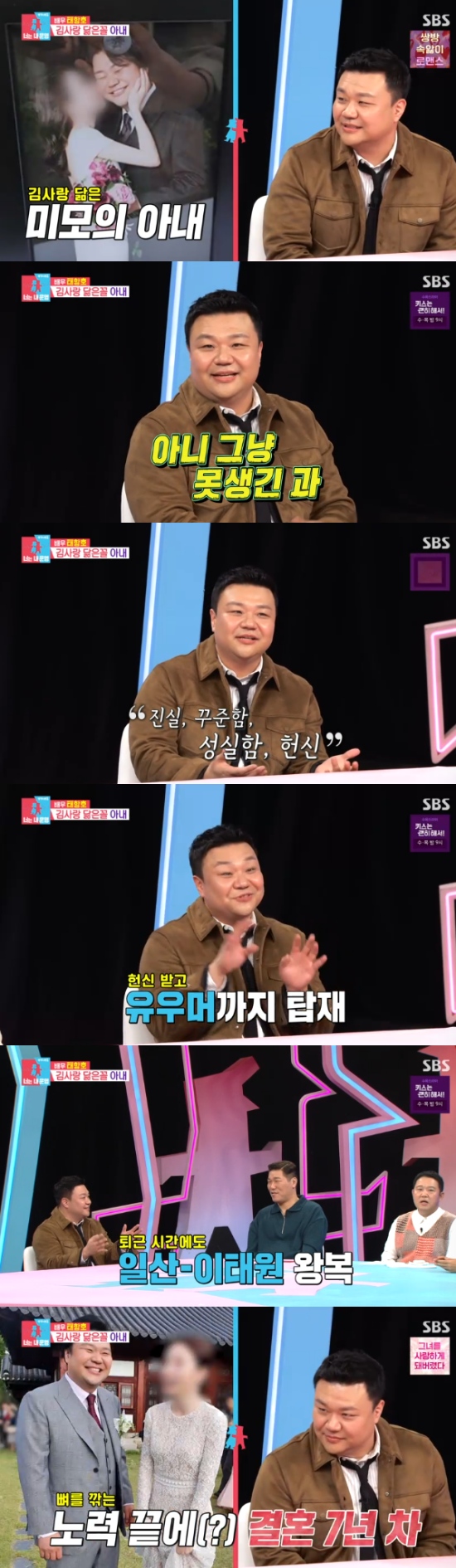 김숙은 "아내를 사로잡은 비결이 무엇이냐"고 궁금해했고, 태항호는 "저희처럼 못생긴 과는 진실, 꾸준함, 성실함, 헌신이 있어야 한다"고 말했다.