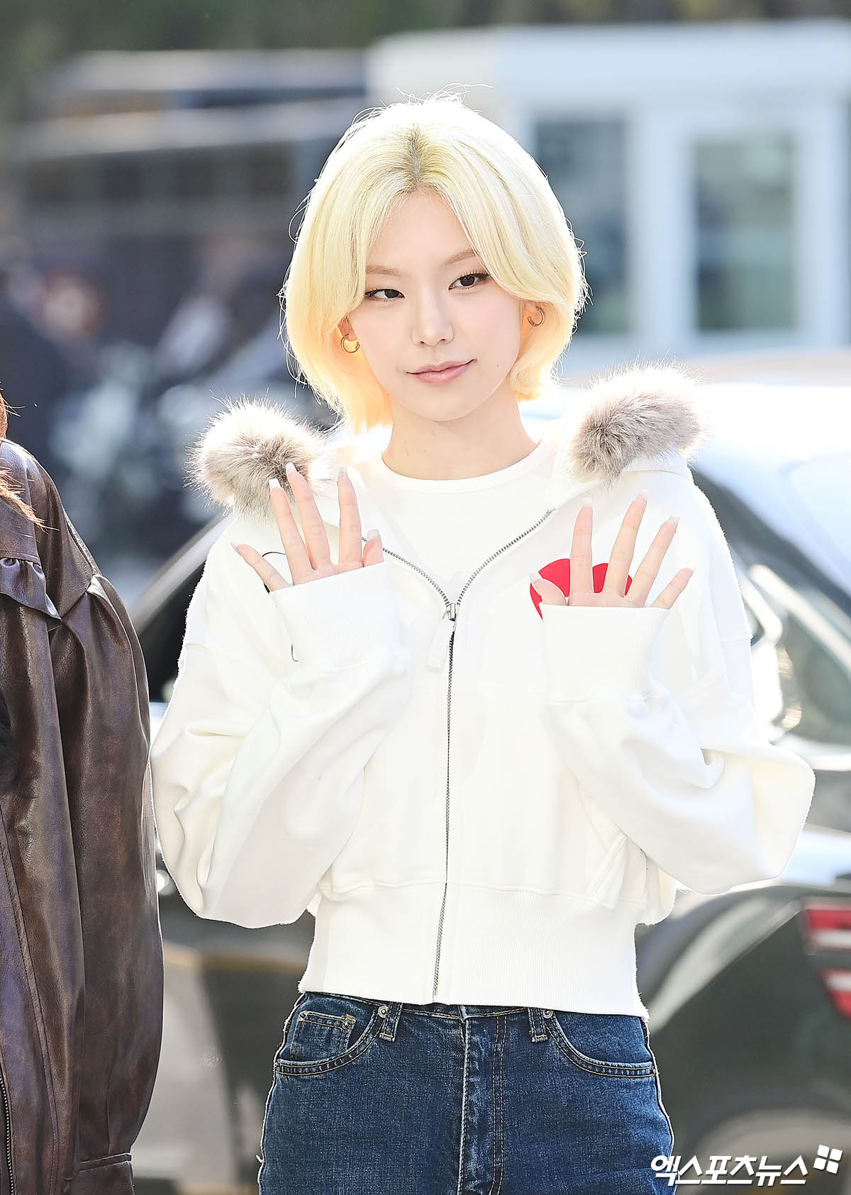 이날 생방송에 참석한 있지 예지가 출근길에 포즈를 취하고 있다.