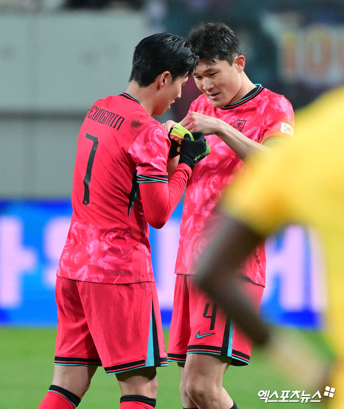 (엑스포츠뉴스 서울월드컵경기장, 김한준 기자) 18일 오후 서울월드컵경기장에서 열린 대한민국과 가나의 축구 대표팀 평가전, 대한민국 손흥민이 교체되며 김민재에게 주장 완장을 건네고 있다.