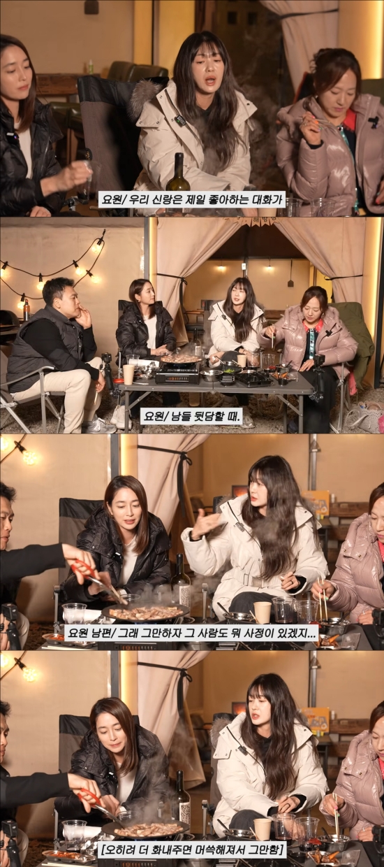 캠핑장에서 수다를 떨던 중 남편 이야기도 언급했다. 이요원은 "모이실 때마다 애들 얘기만 하실 것 같다"는 제작진의 말에 "어쩔 수가 없다. 부부도 오래 살면 할 얘기가 그거밖에 없다"고 말했다.