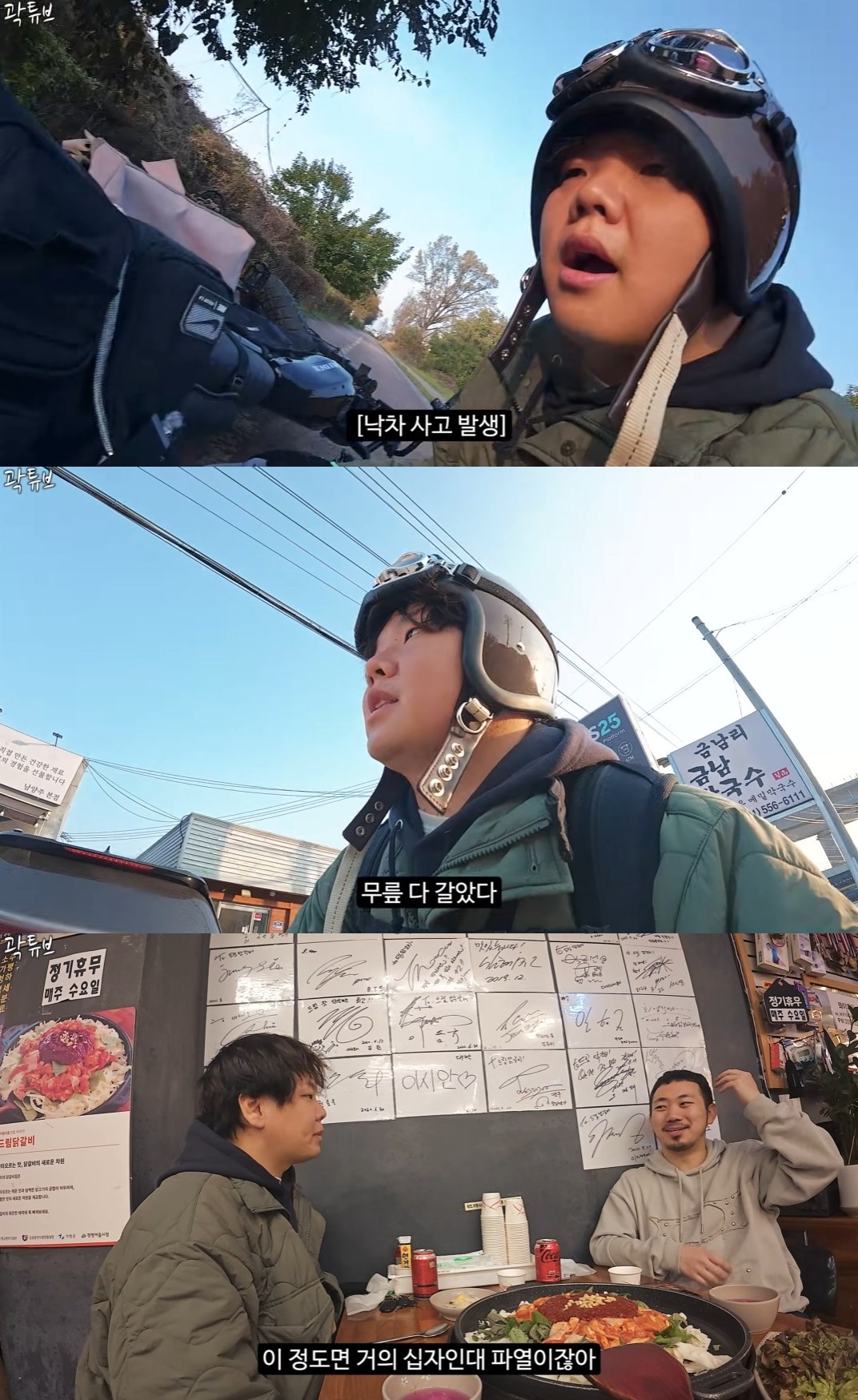라이딩 후 곽튜브는 닭갈비집에 도착했다. 그는 "무릎 부상 이후에 부터 그렇지. 이정도면 거의 십자인대 파열이잖아. 나니까 버티고 온 거지"라며 부상을 언급하기도.