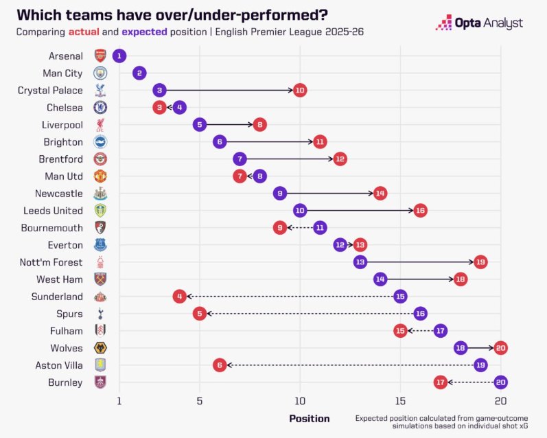 매체에 따르면 축구통계매체 '옵타'는 최근 2025-2026시즌 잉글랜드 프리미어리그 11라운드가 끝나자 구단들의 경기력을 분석해 실제 순위와 예상 순위 간의 격차를 공개했다.