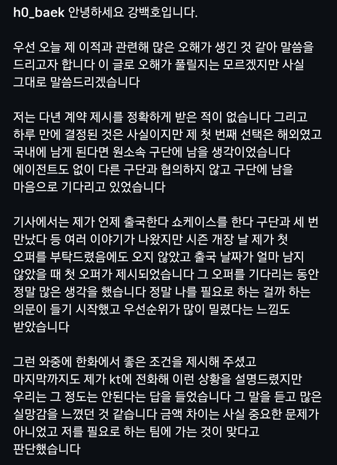 그런 와중에 한화에서 좋은 조건을 제시해 주셨고 마지막까지도 제가 kt에 전화해 이런 상황을 설명드렸지만 우리는 그 정도는 안된다는 답을 들었습니다. 그 말을 듣고 많은 실망감을 느꼈던 것 같습니다. 금액 차이는 사실 중요한 문제가 아니었고 저를 필요로 하는 팀에 가는 것이 맞다고 판단했습니다.