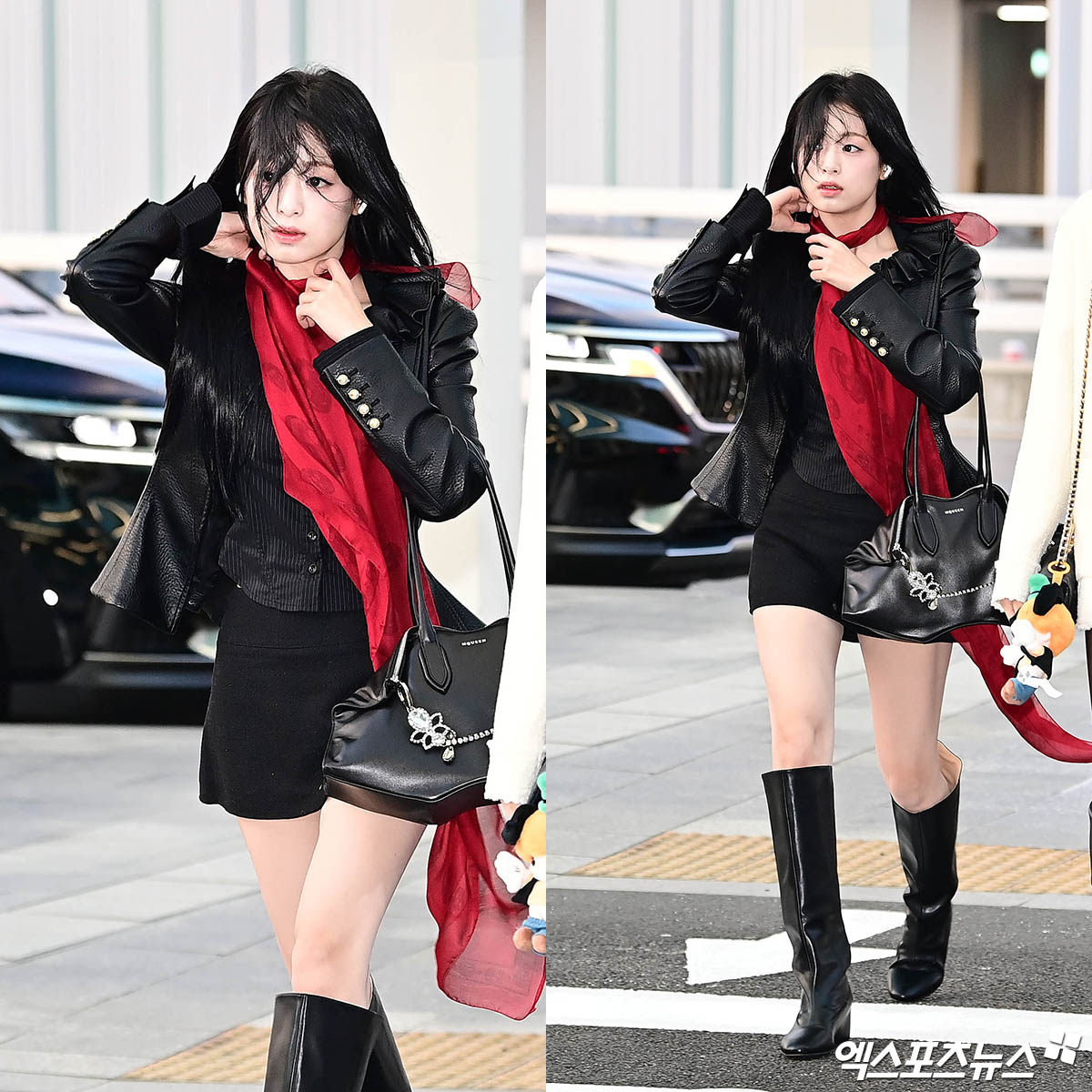 짧은 기장의 블랙 레더 재킷을 착용해 엣지 있는 록시크 무드를 연출했다. 재킷 아래로는 미니스커트를 매치해 눈부신 각선미를 드러냈으며, 종아리를 덮는 블랙 롱 부츠를 착용해 시크함을 더했다.