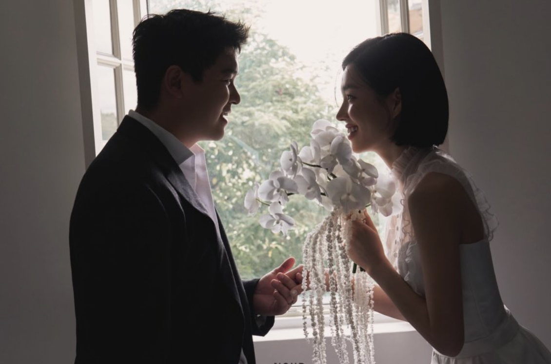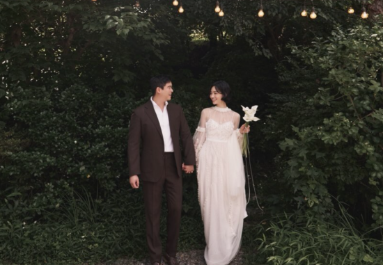 사진 속 조혜원은 우아한 분위기의 웨딩드레스를 입고 설렘 가득한 미소를 짓고 있으며, 이장우는 수트 차림으로 따뜻한 눈빛을 보내고 있다.