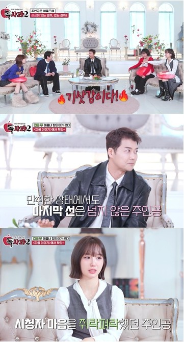 이를 지켜본 의뢰인은 뿌듯해하면서 “다른 여자들이랑 캠핑하니까 좋아?”라며 주인공 앞에 나타났다. 이어진 둘만의 시간에서 주인공은 의뢰인에게 “우리 결혼해야지~”라며 애교를 부렸고, 의뢰인은 ‘독사과’ 실험을 통해 더욱 굳건해진 사랑을 확인하며 행복한 미소를 지었다. 전현무는 “만취한 상황에서도 선을 지켰다”며 ‘엄지 척’을 보냈고, 윤태진 역시 “우리가 주인공에게 밀당 당했다. 진짜 재밌었다”며 이번 연애 실험을 통해 더욱 단단해진 커플의 사랑을 응원했다.