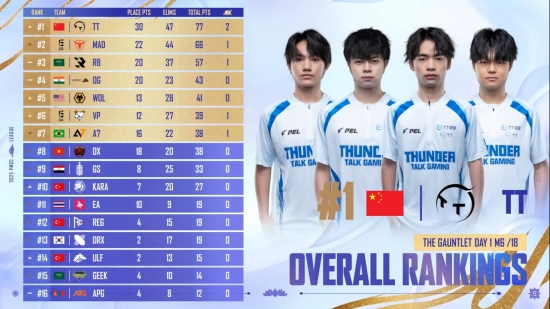 (엑스포츠뉴스 이정범 기자) '2025 PMGC' TT가 The Gauntlet 1일 차 1위를 차지했다.