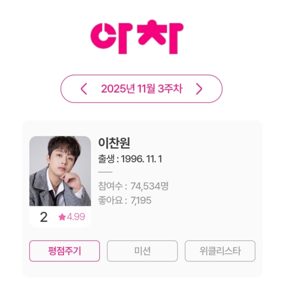 최근 아이돌차트에 따르면, 이찬원은 11월 3주 차 평점랭킹에서 2위를 기록했다.
