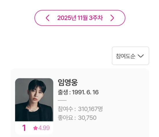 아이돌차트에 따르면, 지난 11월 17일부터 11월 23일까지 집계된 평점랭킹에서 임영웅은 31만 167표를 얻어 최다득표를 기록했다.