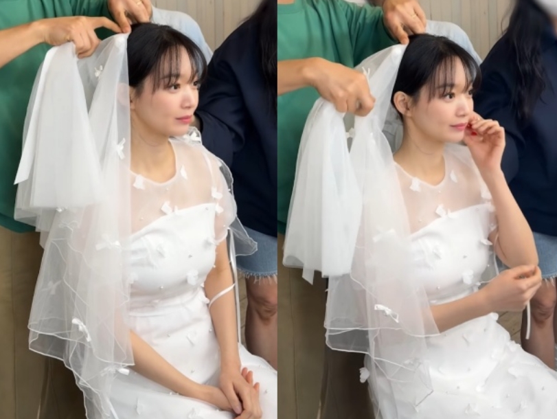 신민아가 드라마 '손해 보기 싫어서' 속 결혼식 장면을 준비 중이다