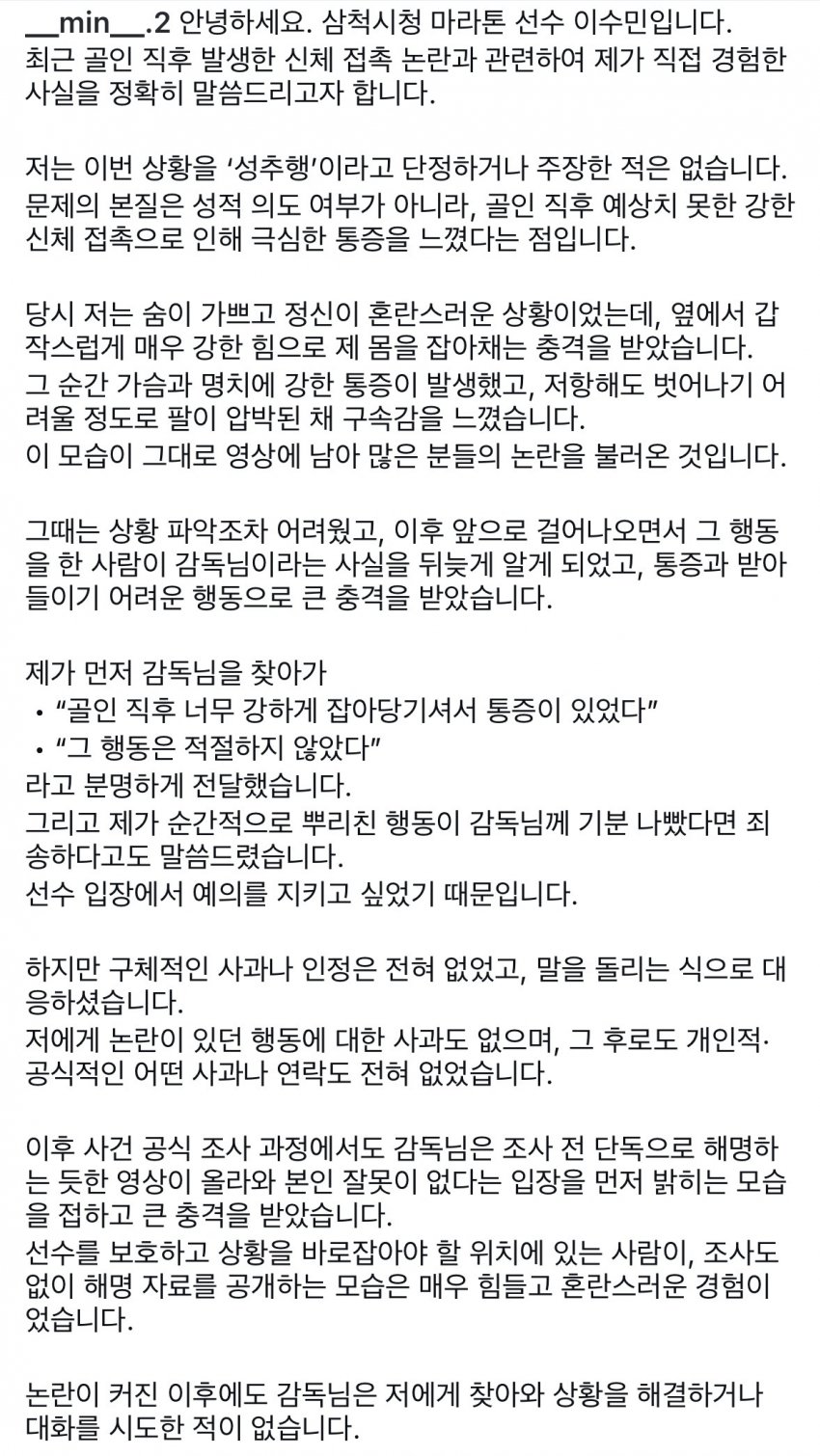 (엑스포츠뉴스 나승우 기자) 최근 인천국제마라톤에서 발생한 김완기 삼척시청 감독의 선수 신체 접촉 논란과 관련해 당사자인 마라토너 이수민(삼척시청)이 침묵을 깨고 직접 입장을 밝혔다.
