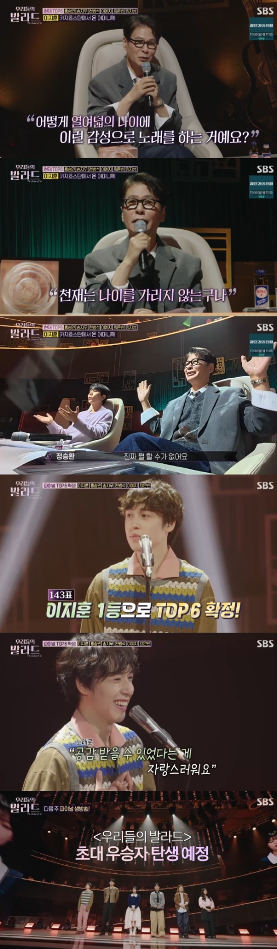 지난 25일 방송된 SBS 예능 프로그램 '우리들의 발라드'에서 이지훈, 홍승민, 송지우, 천범석, 이예지, 최은빈이 TOP 6로 확정돼 다음 주 생방송 파이널 무대에 오르게 됐다.