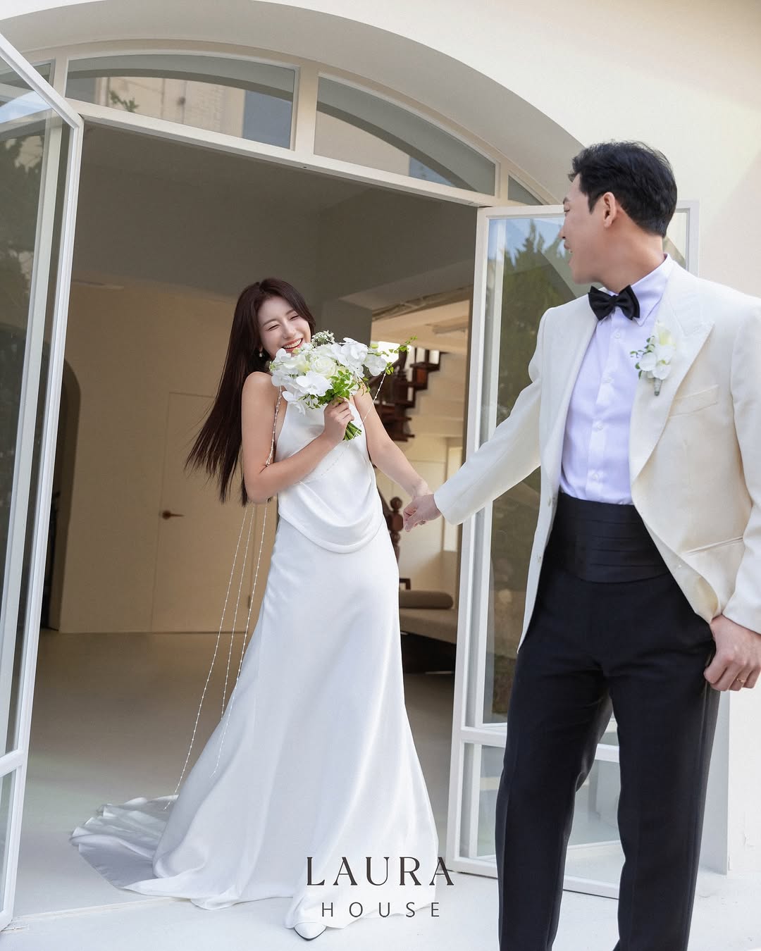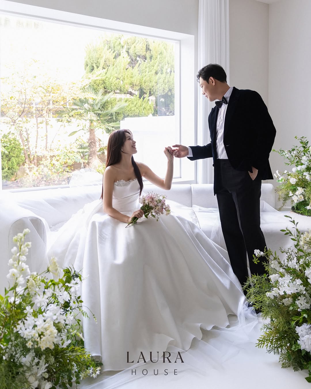 공개된 사진 속 두 사람은 순백의 웨딩드레스와 턱시도를 입고 밝은 미소를 지으며 서로를 바라보고 있다. 이들의 모습은 마치 로맨틱 영화의 한 장면처럼 따뜻하고 행복한 분위기를 자아낸다.