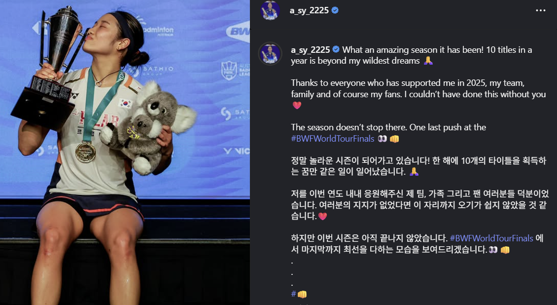 (엑스포츠뉴스 윤준석 기자) 여자 배드민턴 세계 최강자로 자리매김한 안세영이 시즌 10관왕 달성 후 자신의 SNS를 통해 팬들에게 감사 인사를 올리고 올 시즌 되돌아보는 진솔한 소감을 전했다.