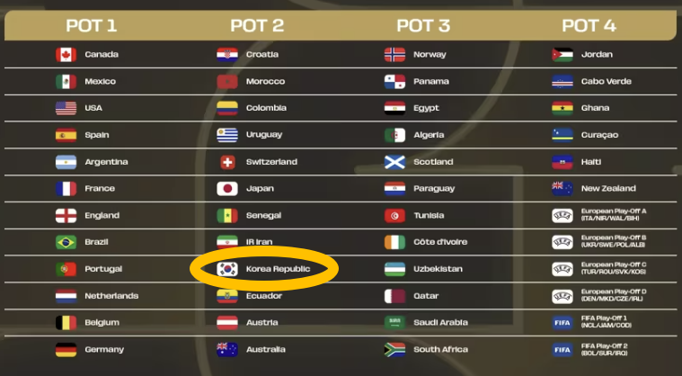 국제축구연맹(FIFA)이 지난 26일 공개한 2026 북중미 월드컵 포트 배정 방식에 따르면 한국은 사상 최초로 월드컵 포트2에 들어갔다.
