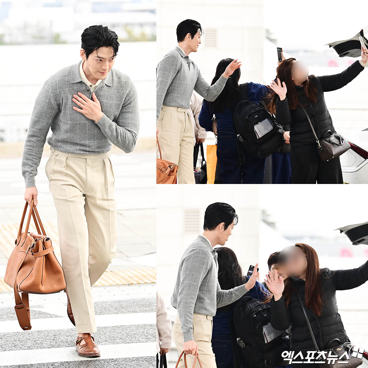 횡단보도를 향해 걸어가던 김우빈을 알아본 공항 이용객들이 기념 사진을 촬영하자, 김우빈은 살짝 무릎을 굽혀 핸드폰 화면에 키를 맞추는 센스를 선보여 감탄을 자아냈다. 이어 그들에게 부드러운 미소로 인사를 전하며 잊을 수 없는 기억을 선물했다.