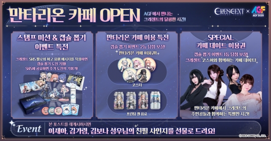 더불어 SNS 팔로우 이벤트와'크레센트' 응원 메시지월 작성 이벤트에 참여하면 카페 이용권, 코스어와 함께하는 카페 데이트 체험 기회 등을 얻을 수 있다.