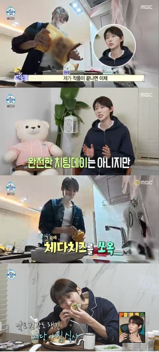 서범준은 양치부터 한 뒤 불고기 위에 치즈를 뿌리며 아침 준비를 했다.