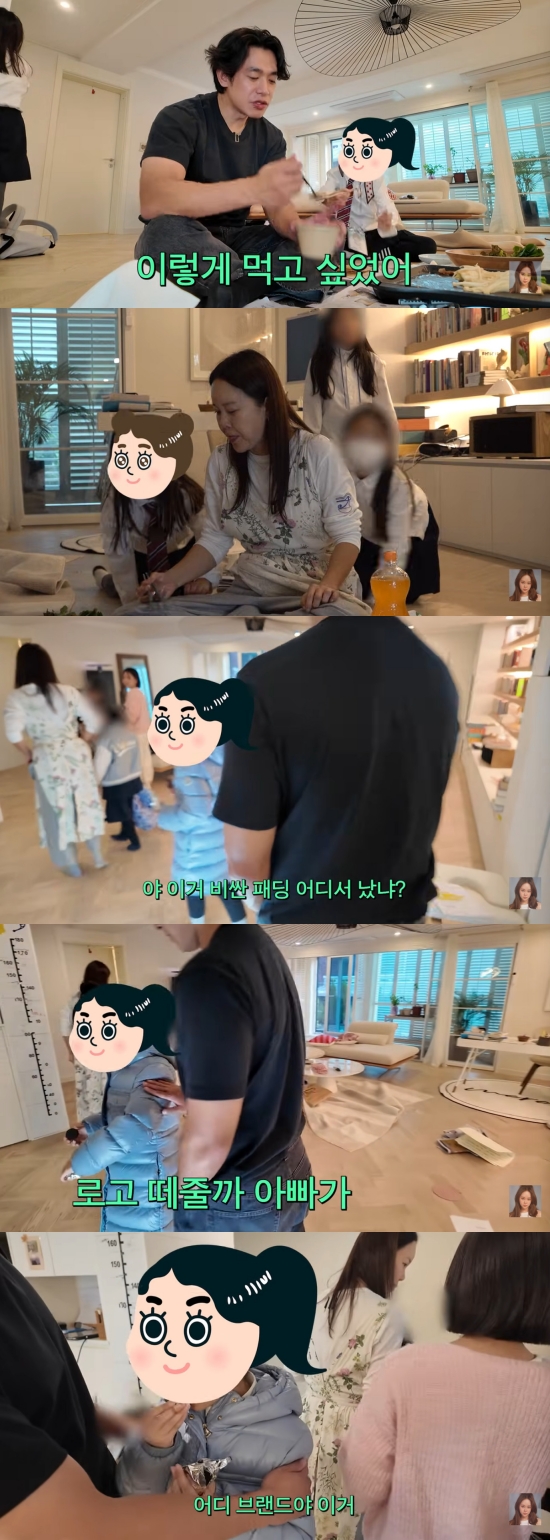 한참을 놀다 다시 밖을 나서는 아이들을 보던 정석원은 딸 하임이의 새 패딩을 보고 "이 비싼 패딩 어디서 났냐. (누가 훔쳐 갈지 모르니까) 테이프 붙여. 아빠가 로고 떼줄까? 가위로 잘라보자"며 장난을 쳤다.