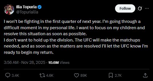 (엑스포츠뉴스 윤준석 기자) UFC 라이트급 챔피언 일리아 토푸리아가 개인적 사정으로 잠정 휴식 선언을 했다.