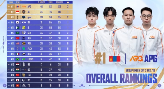 한국의 디플러스 기아(DK)가 속한 그룹스테이지 그룹 그린. 2일 차 경기를 치른 결과, APG가 3치킨, 128점으로 1위 자리를 지켰다. 그리고 뒤를 이어 AE가 100점으로 2위, goat가 95점으로 3위(2치킨), DK가 95점(1치킨)으로 4위, IC가 86점으로 5위, GEN이 81점으로 6위, SUP이 78점으로 7위에 이름을 올렸다.