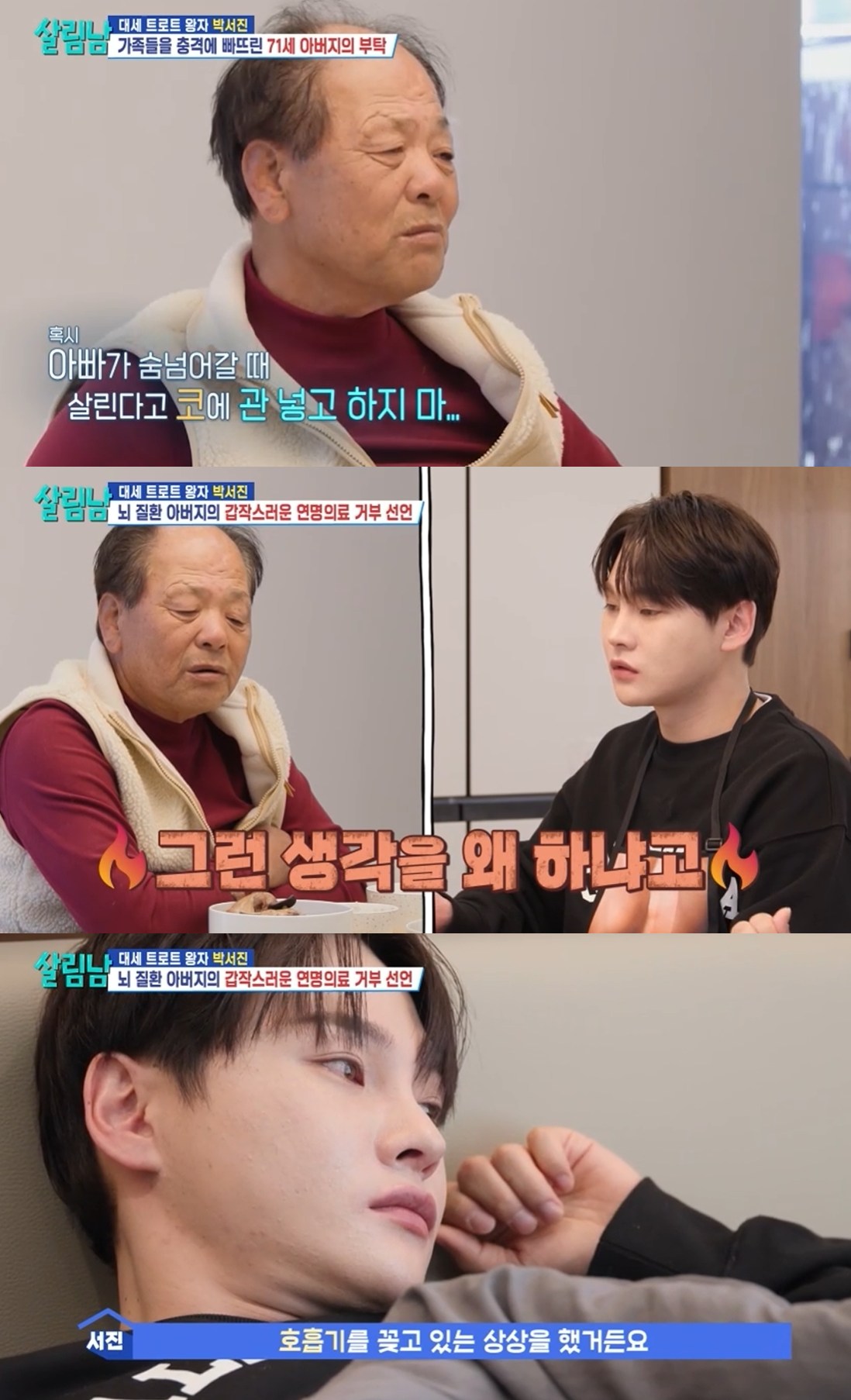아버지의 말에 충격을 받은 박서진은 "살 수 있는 사람은 살려야 하는 거다. 왜 벌써 그런 생각을 하느냐"며 이해할 수 없다는 듯 답답함을 드러냈다.