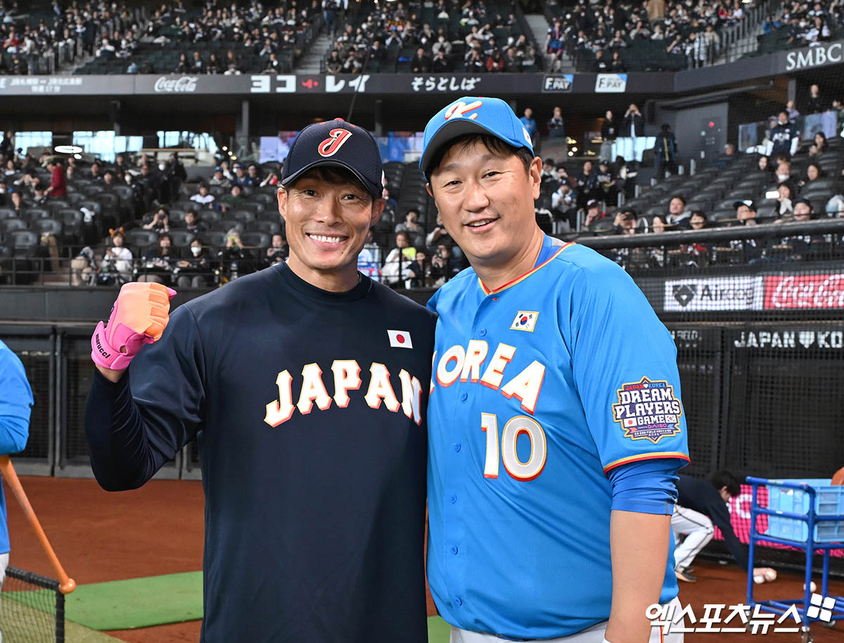 (엑스포츠뉴스 사진영상팀) 30일 일본 에스콘필드 홋카이도에서 열린 한일 야구 레전드 선수간 친선 경기 '한일 드림 플레이어즈 게임'에 앞서 이대호가 이토이 요시오와 기념 촬영을 하고 있다.