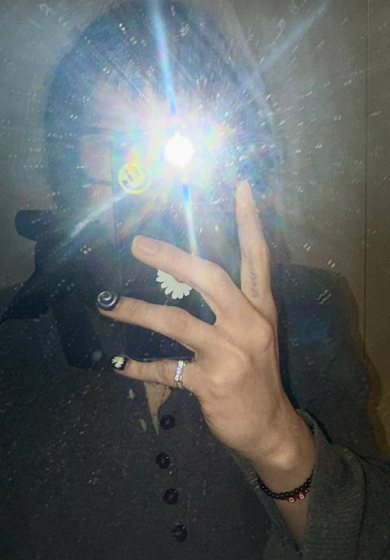 사진 속 지드래곤은 플래시를 터뜨린 채 거울 셀카를 촬영하고 있다. 얼굴은 휴대폰으로 가려졌지만, 독특한 패턴의 네일아트, 반지, 팔찌 등 감각적인 스타일링이 시선을 끈다.